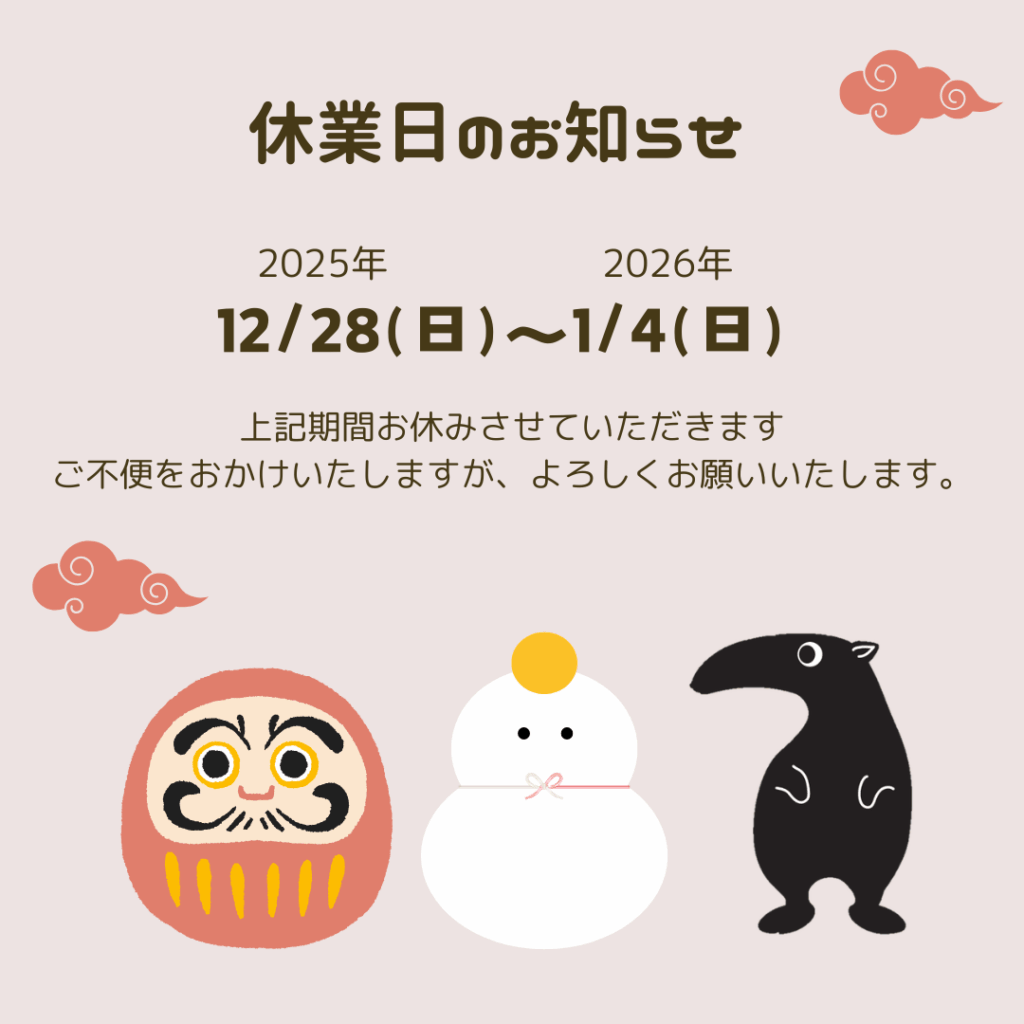 2025.12.20News 【年末年始休業のお知らせ】 平素より格別のご愛顧を賜り、誠にありがとうございます。誠に勝手ながら、下記の期間を年末年始休業とさせていただきます。 ■休業期間2025年12月28日(日)~2026年1月4日(日) ■営業再開2026年1月5日(月)より通常営業いたします。 休業期間中にいただきましたお問い合わせにつきましては、営業再開日より順次ご対応させていただきます。 ご不便をおかけいたしますが、何卒ご理解のほどよろしくお願い申し上げます。 ニュース一覧を見る 〈前の記事へ ニュース一覧を見る 次の記事へ〉
